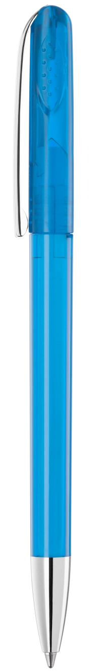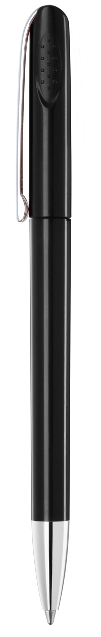 Drehkugelschreiber mit gedeckt silbernem Gehäuse, Bogenclip silber matt und schwerer Metallspitze matt verchromt.