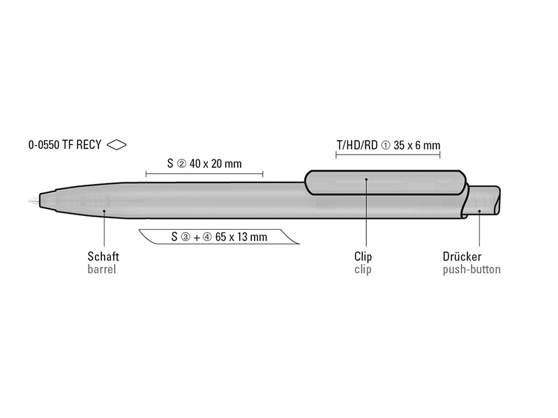 Druckkugelscheiber mit transparent gefrostetem Gehäuse, Clip und Drücker aus recyceltem ABS-Kunststoff. Eingelassene Griffzone. Das Modell ist mit dem Recyclingzeichen gekennzeichnet. Dank der europäischen und ClimatePartner-zertifizierten Produktion leistet der uma STAGE frozen RECY einen zusätzlichen nachhaltigen Beitrag zur Schonung der Umwelt. Aufgrund der Besonderheit des Materials (ABS Recycled Plastic) sind produktionstechnische Farbschwankungen gegeben.
