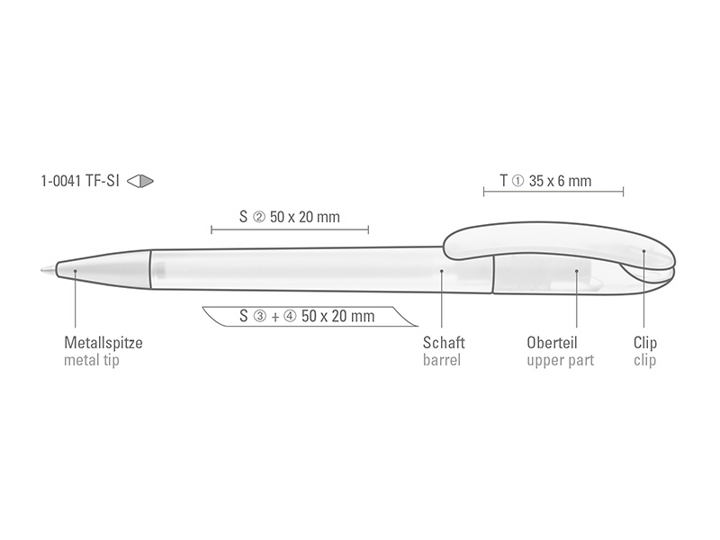 Drehkugelschreiber mit transparent gefrostetem Gehäuse. Schwere matt verchromte Metallspitze.