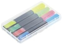 Liquid highlighter set consisting of 4 LIQEO HIGHLIGHTERS in clear transparent plastic packaging. Standard colours for highlighters are yellow, green, pink and blue. Optional colours orange and purple can be chosen.