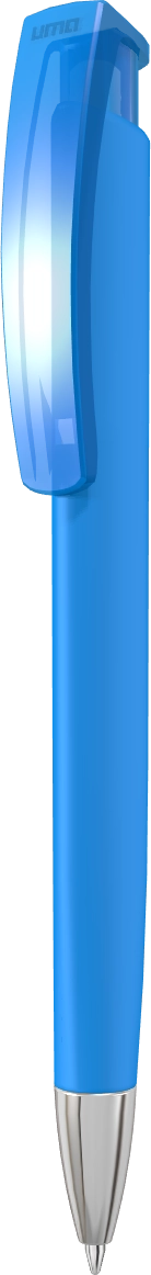 Stylo bille rétractable avec corps triangulaire caoutchouteux, clip opaque brillant et lourde pointe en métal chromée brillante.